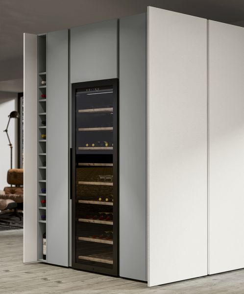 Immagina di entrare in una cucina dove ogni cosa ha il suo posto, e in cui l’eleganza minimalista sa dialogare con una funzionalità sorprendente. Le superfici sono lisce e continue, senza maniglie a interrompere l’armonia visiva: è la colonna-monolite