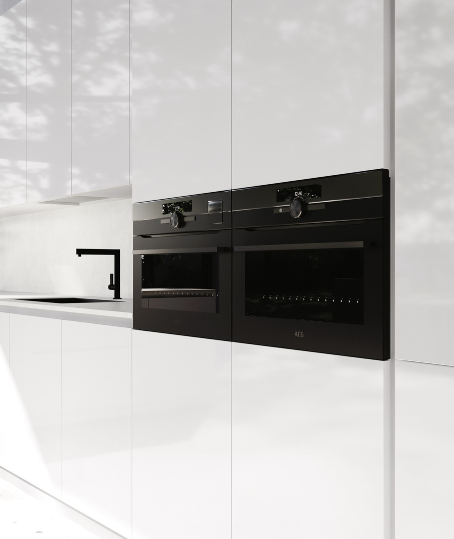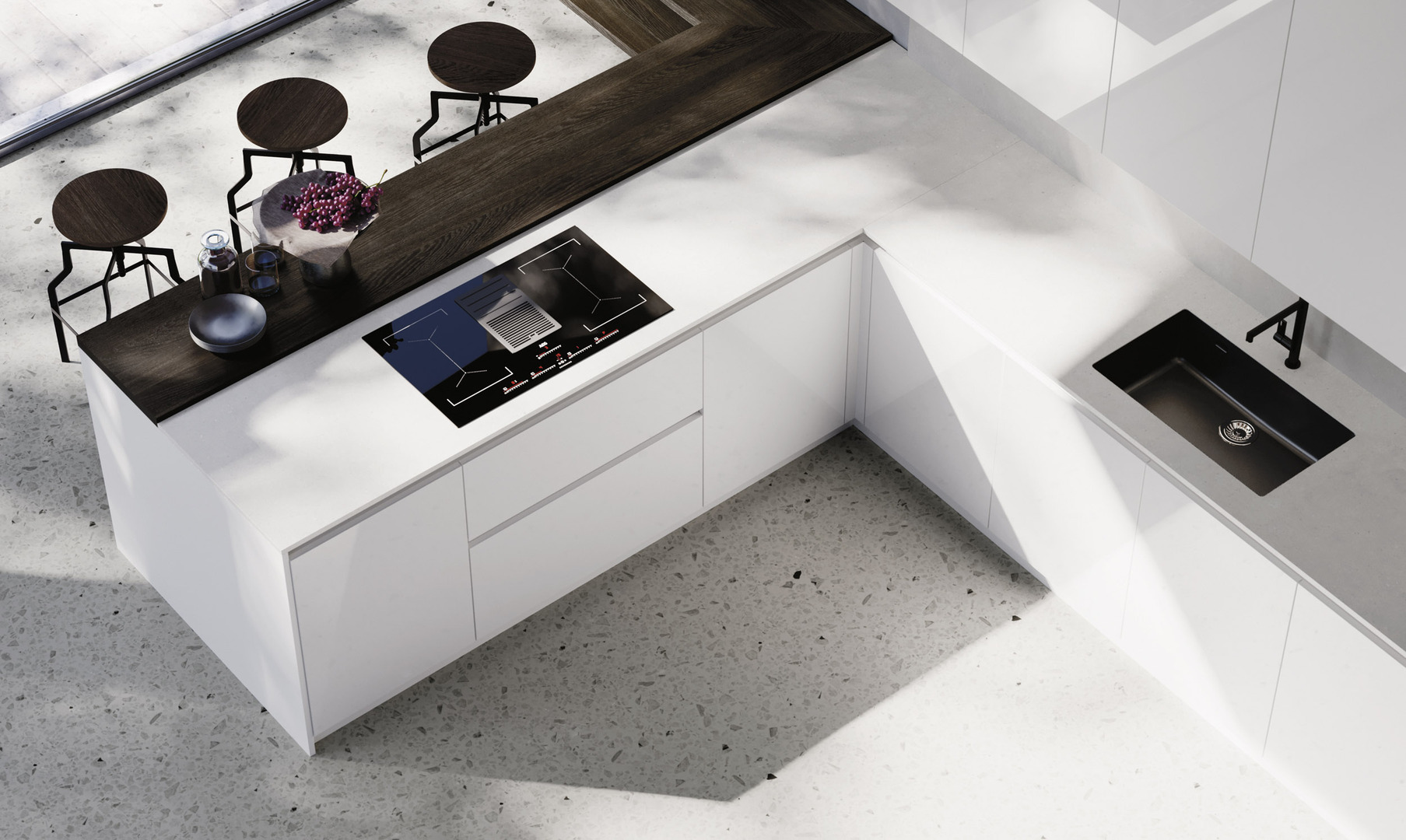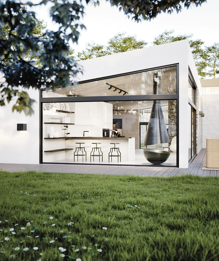 Un progetto all-white, per una cucina luminosa che guarda verso l’esterno della casa riflettendo l’ambiente circostante grazie alle sue superfici in vetro. La disposizione lineare arricchita da una penisola con piano snack in legno massiccio a contrasto, crea un piacevole impatto visivo da ogni prospettiva.