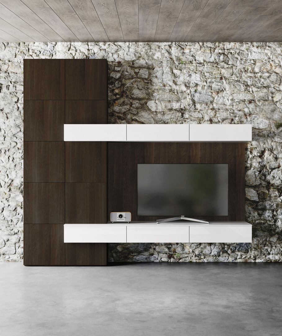 Il living è in perfetta sintonia con i volumi e le cromie della cucina: basi e pensili orizzontali si inseriscono negli elementi verticali, in un incontro di chiaro-scuro tra il vetro colore Cotone e l’impiallacciato Rovere Termocotto.