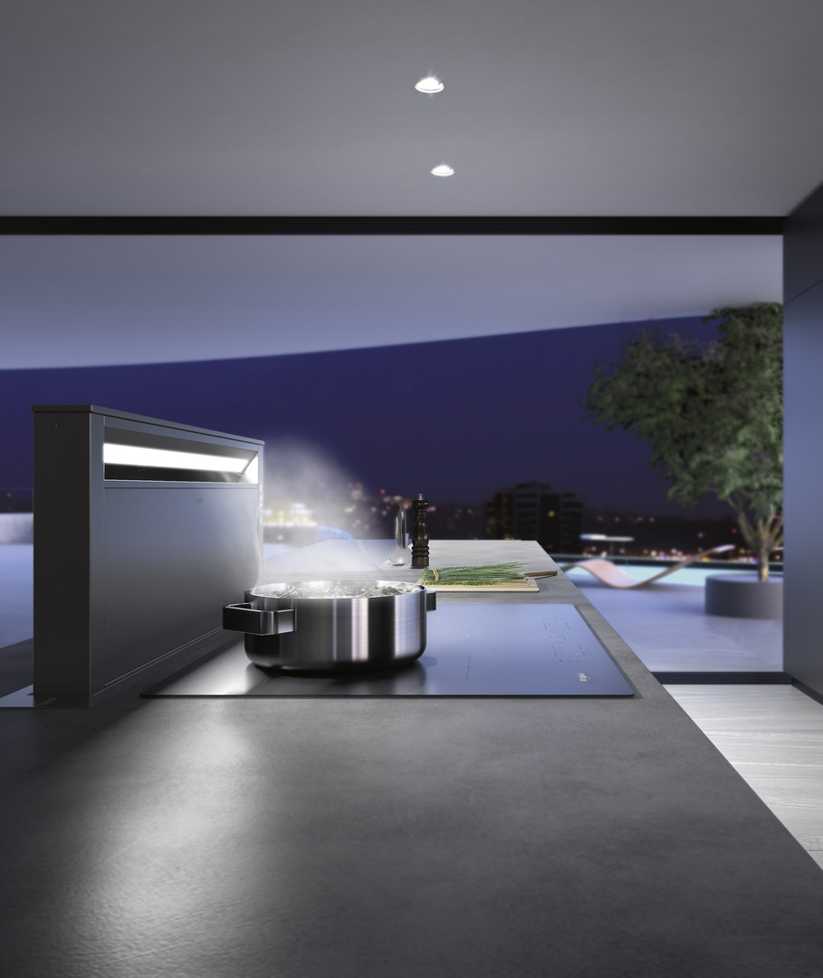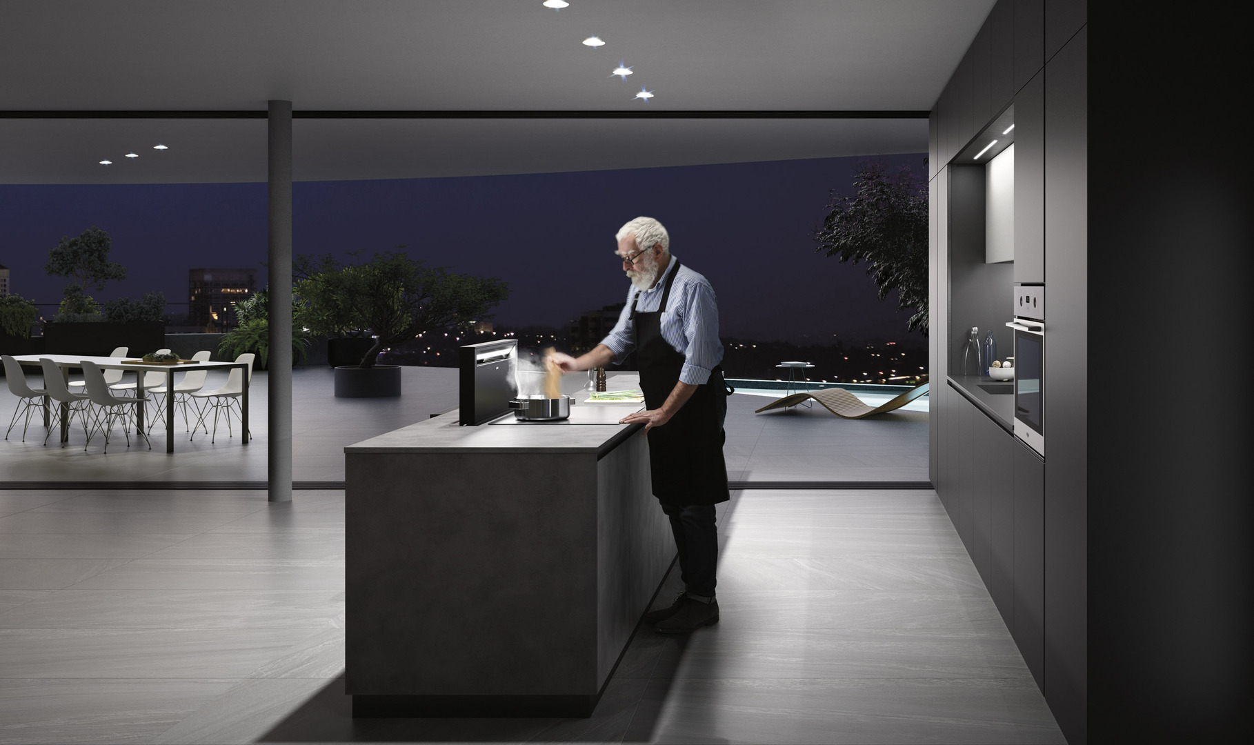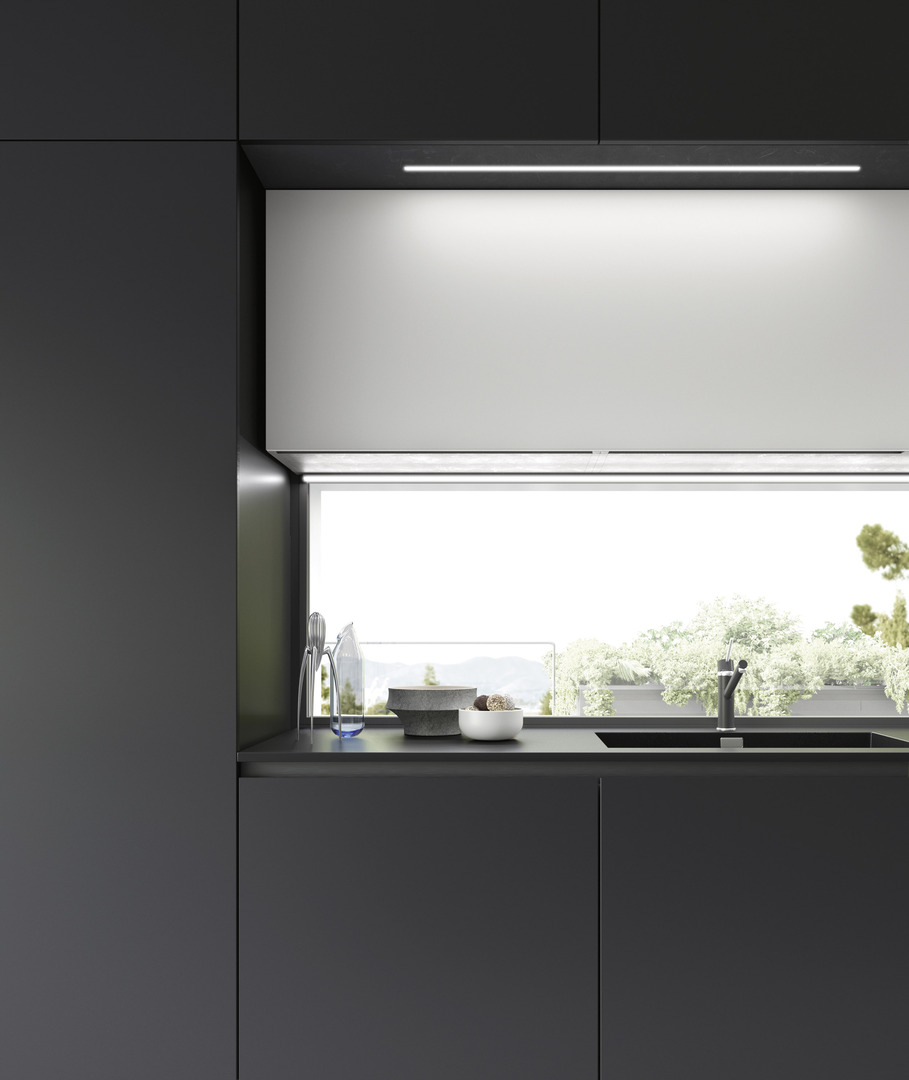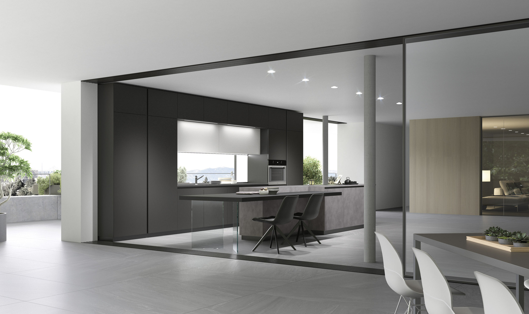La cucina in nero e grigio. Elegante, chic, raffinata: in un ambiente ricco di luce e di piacevolissimi panorami, abbiamo progettato una variante di AL 32 in versione dark, seguendo un concept dalle linee minimali.