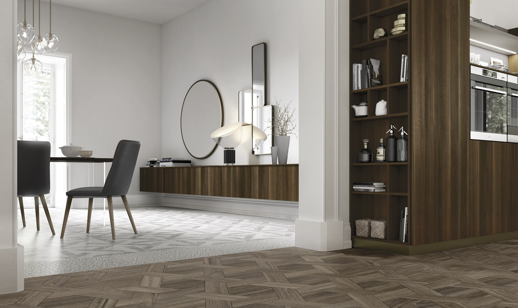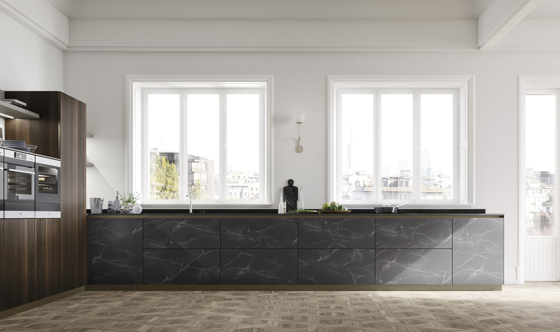 In questo progetto i grafismi lineari e lo sviluppo in orizzontale disegnano una cucina in stile minimal ma con spunti di estrema originalità, grazie alle particolari sfumature delle superfici in legno di eucalipto.