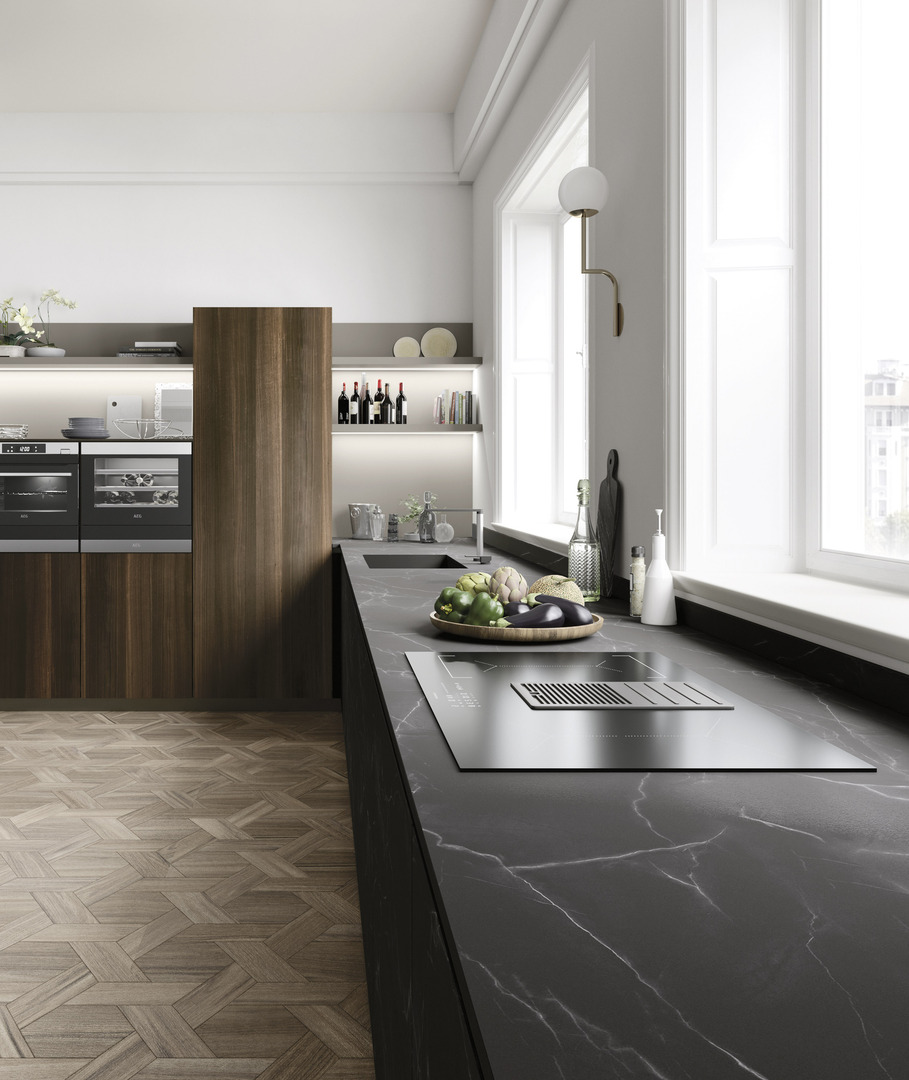 Linee rigorose e squadrate, precise simmetrie, toni scuri, design compatto e aspetto minimal: la cucina moderna esprime l’estetica contemporanea.