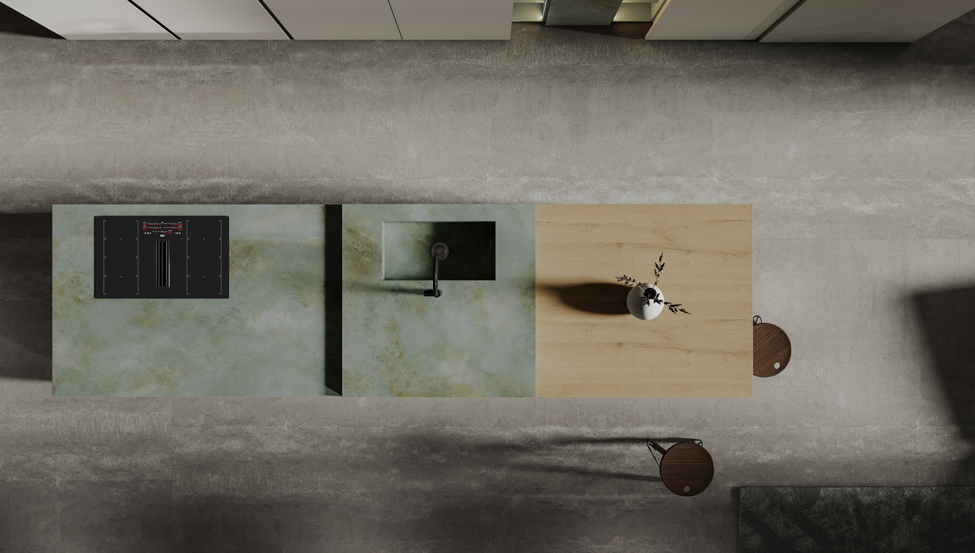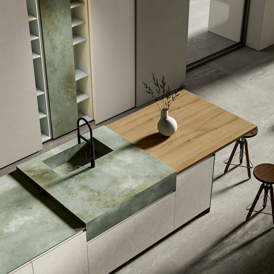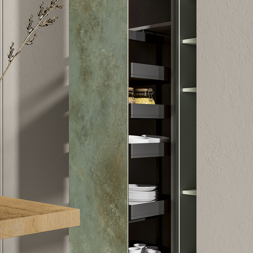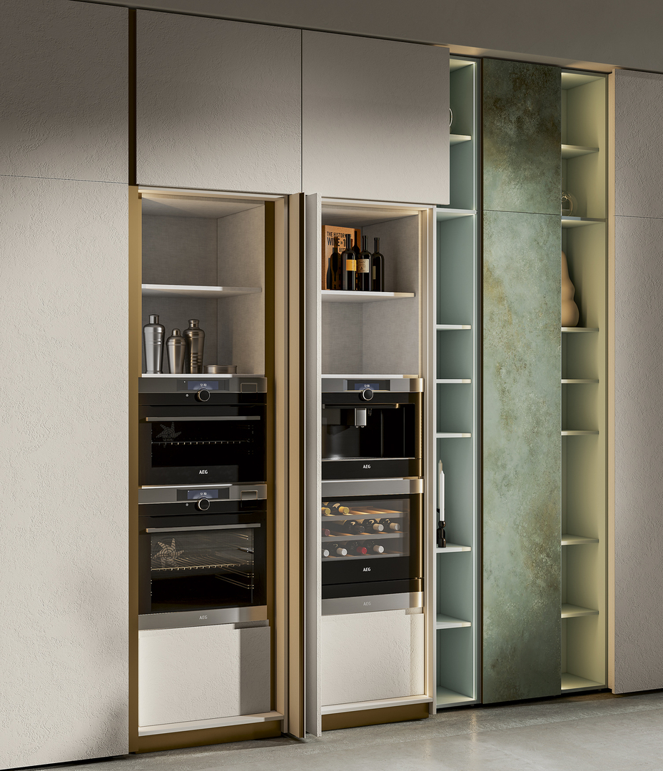 Unendo design e tecnologia, questo progetto di cucina moderna combina con eleganza elementi a vista e a scomparsa, utilizzando materiali innovativi come il PET e il Gres.