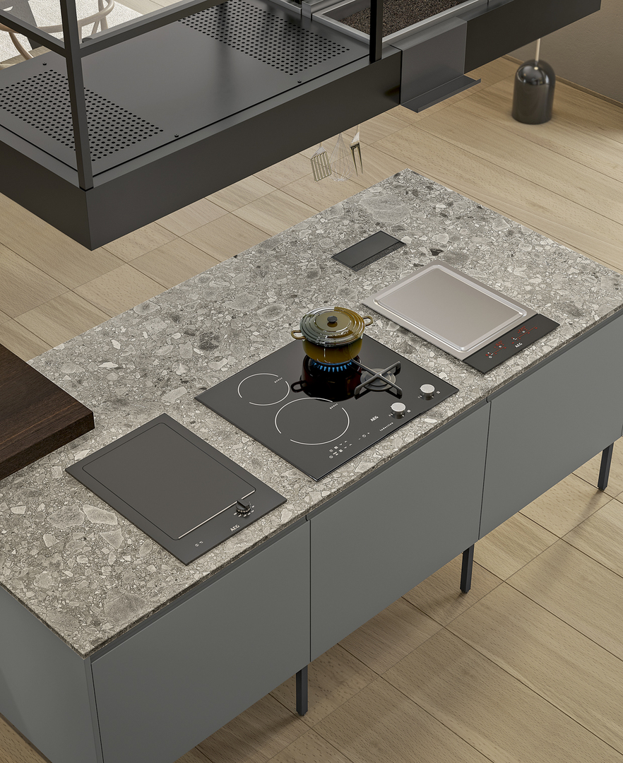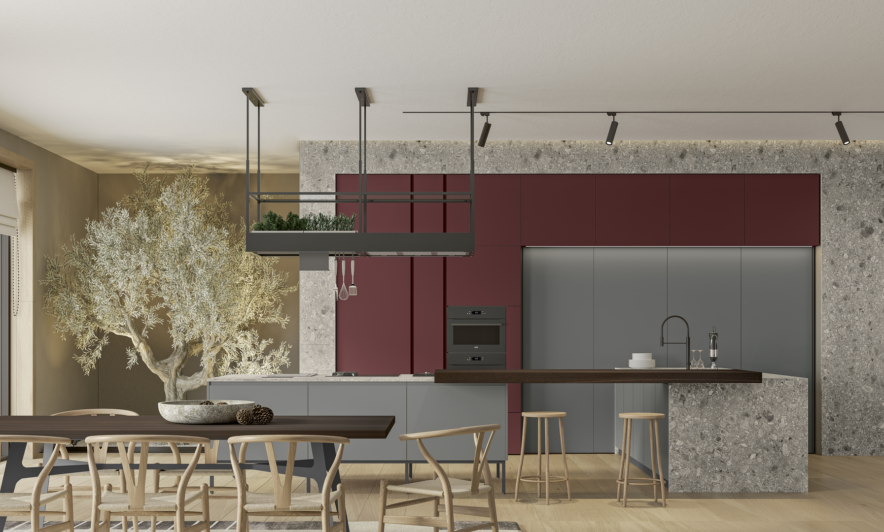 Rosso e grigio di grande impatto. La cucina, con il suo stile moderno senza maniglie, lascia che il colore parli, esprimendo una forte capacità evocativa e comunicativa.