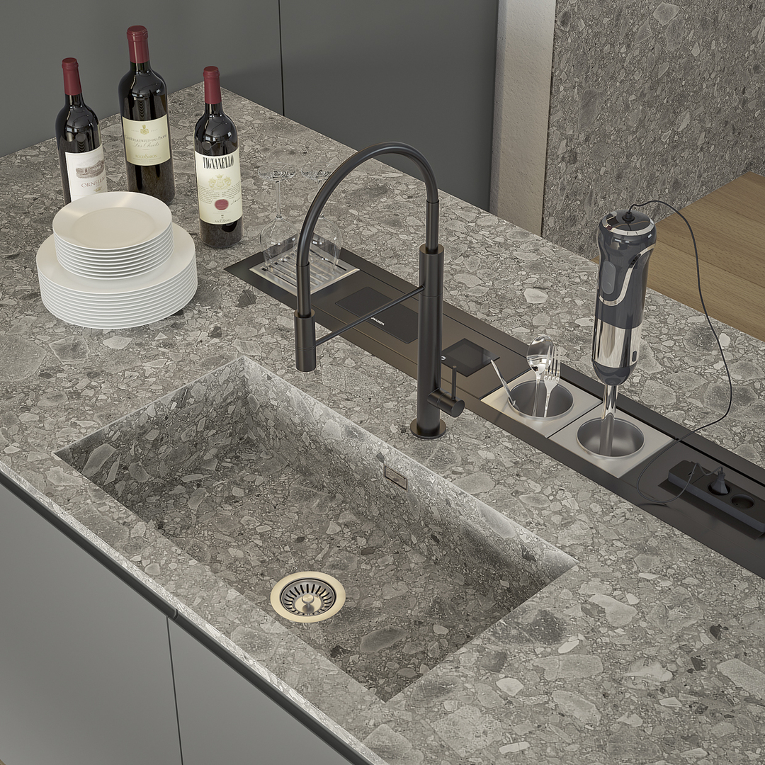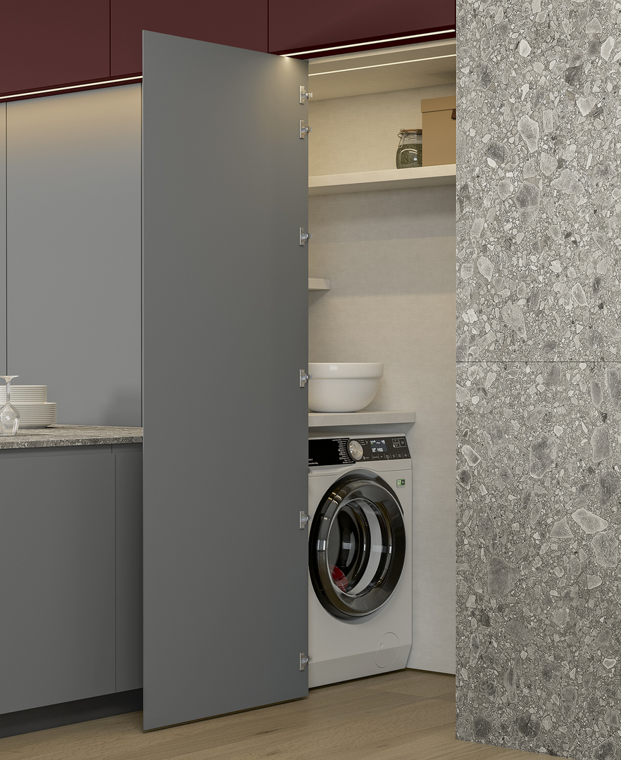 Un design innovativo utilizza al massimo gli spazi: la colonna-dispensa angolare si trasforma in un perfetto vano lavanderia o in qualsiasi altra cosa si desideri.