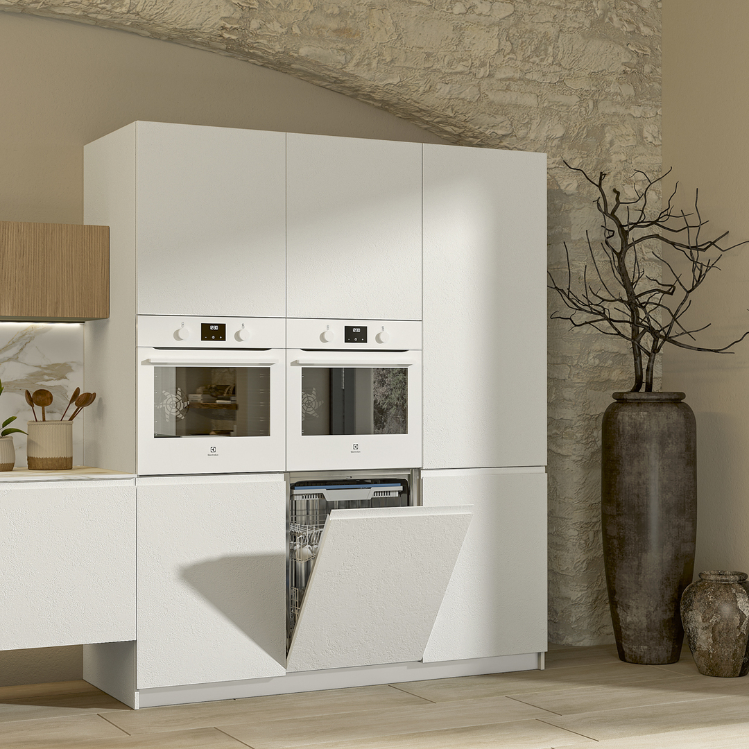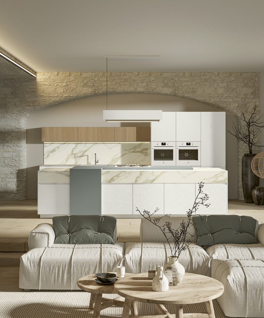 La cucina bianca, arricchita da tocchi di colore, utilizza moduli eterogenei per arredare con libertà e creatività un open-space dal sapore conviviale.