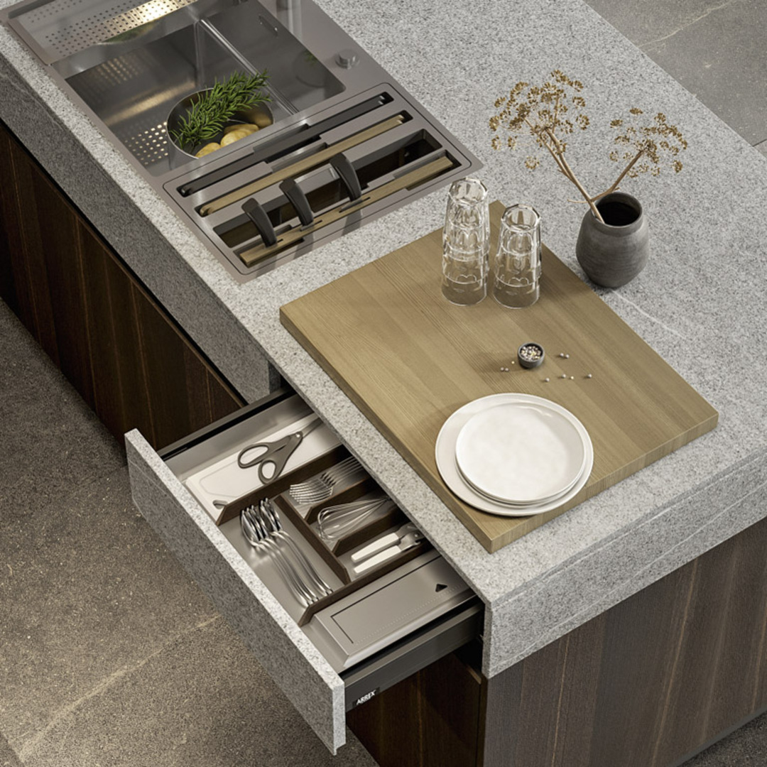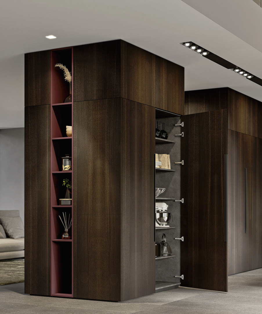 Struttura monolite, operatività a 360 gradi: un unico blocco ospita accessori, elettrodomestici e dettagli di carattere estetico e funzionale.