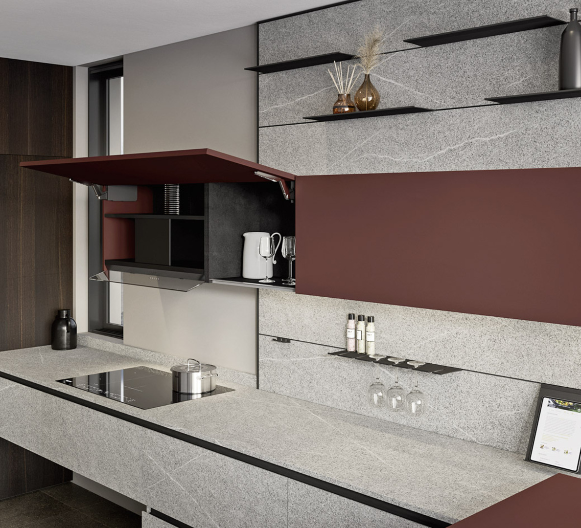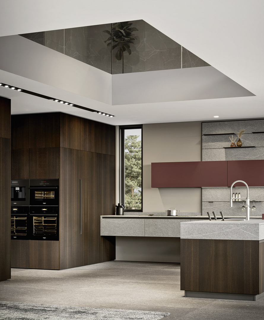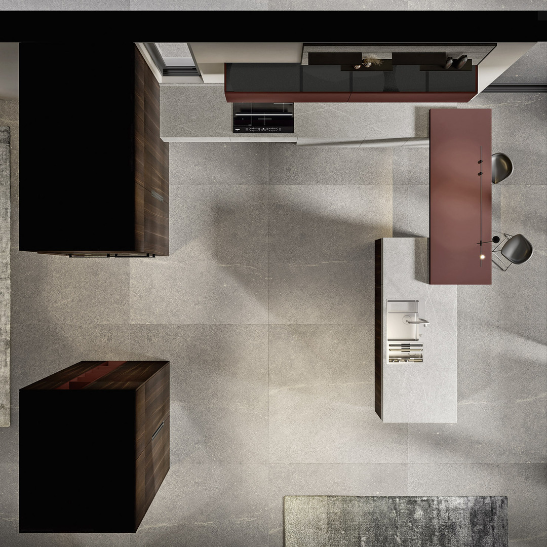 Il piano e le basi dall'effetto materico simile a pietra definiscono l’area operativa del progetto, mentre il colore rosso funge da punto di equilibrio, caratterizzando la cucina e creando un’armoniosa combinazione con le altre due tonalità.
