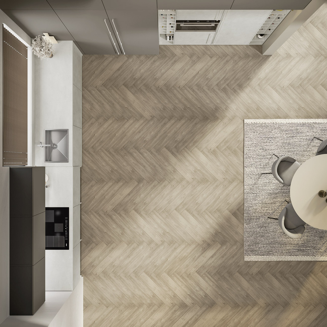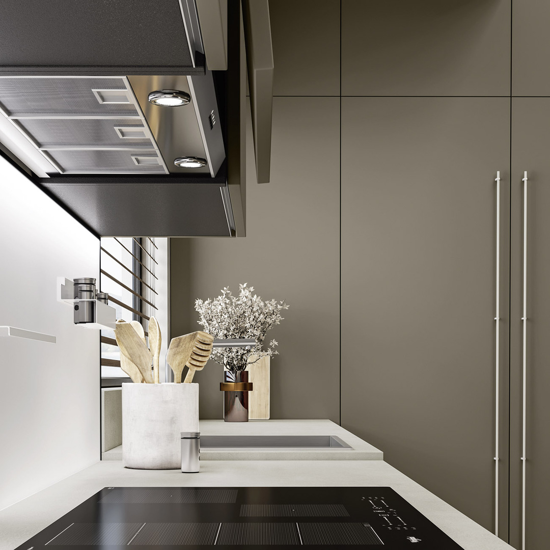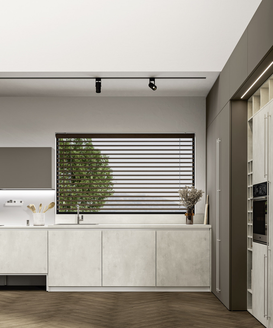 In questo progetto valorizziamo il colore chiaro e sfumato delle superfici con un suggestivo effetto ossidato, armonizzandolo con la tonalità scura e opaca della nuance gianduia. La disposizione a "L", arricchita da ampie colonne a tutta altezza, conferisce all'ambiente un’estetica di alto livello.