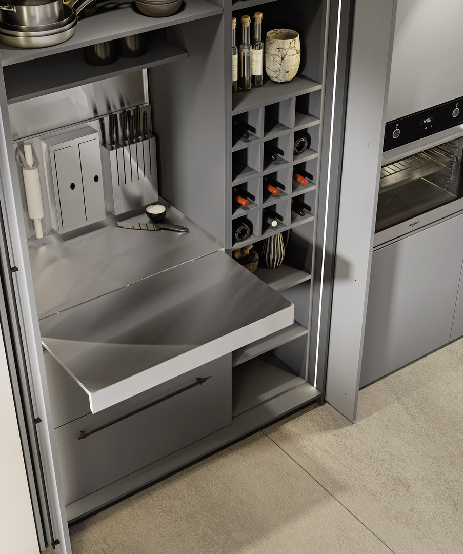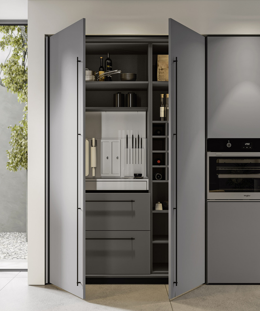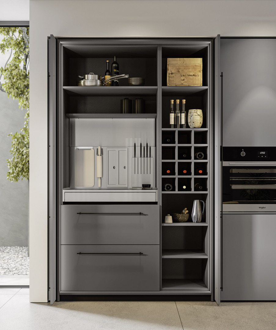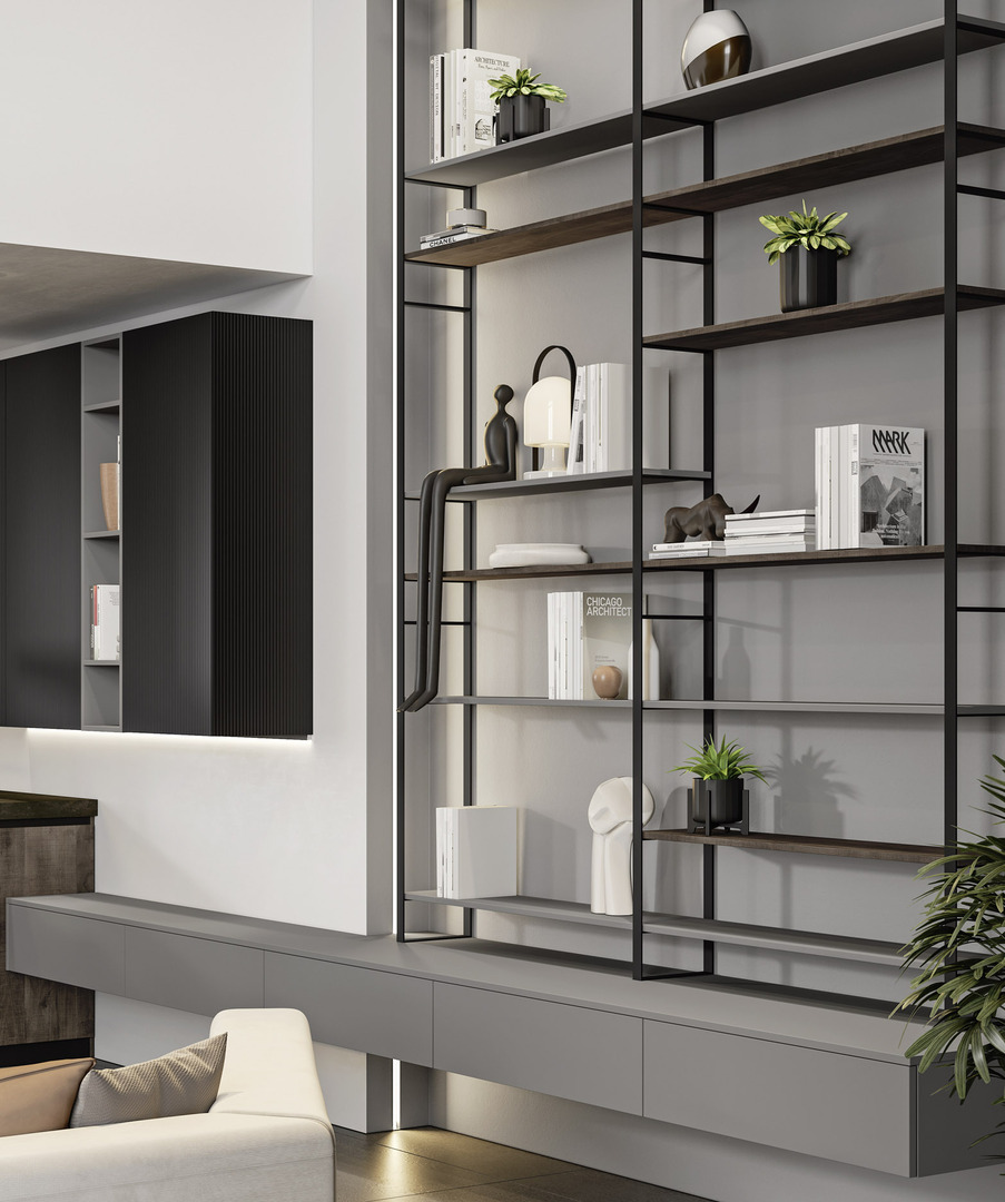 La discreta presenza del metallo, le superfici in vetro cannettato nero e le colonne di colore grigio chiaro richiamano suggestioni industrial dallo stile minimale, arricchite da tocchi di eleganza grazie alla disposizione equilibrata dei volumi.