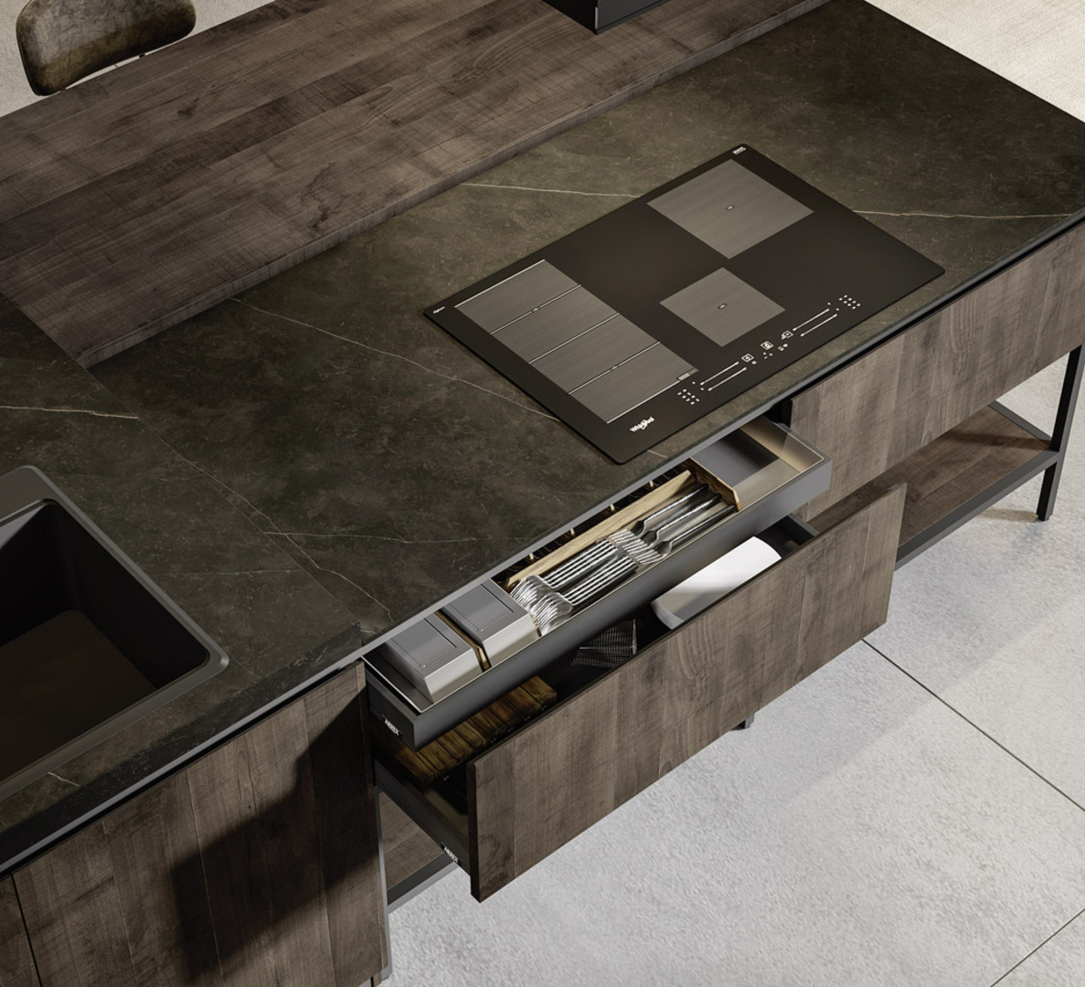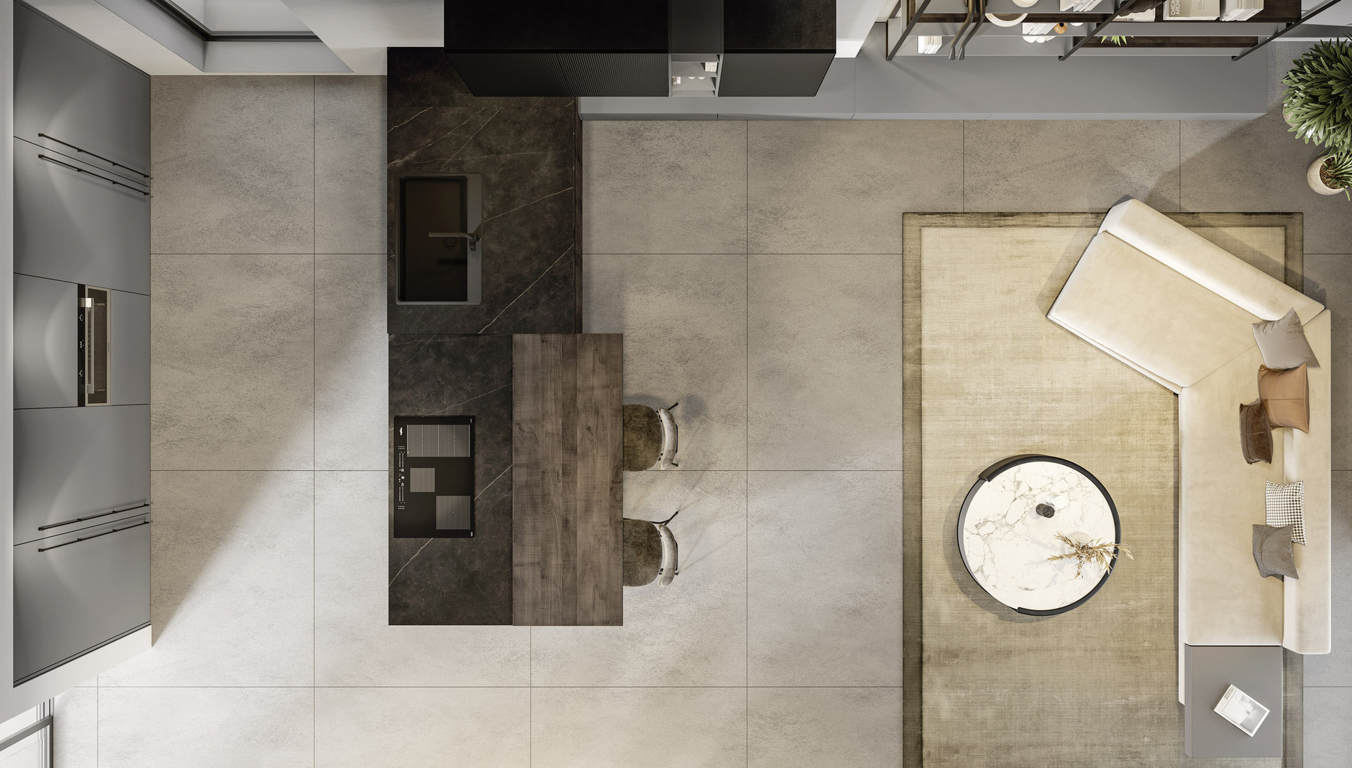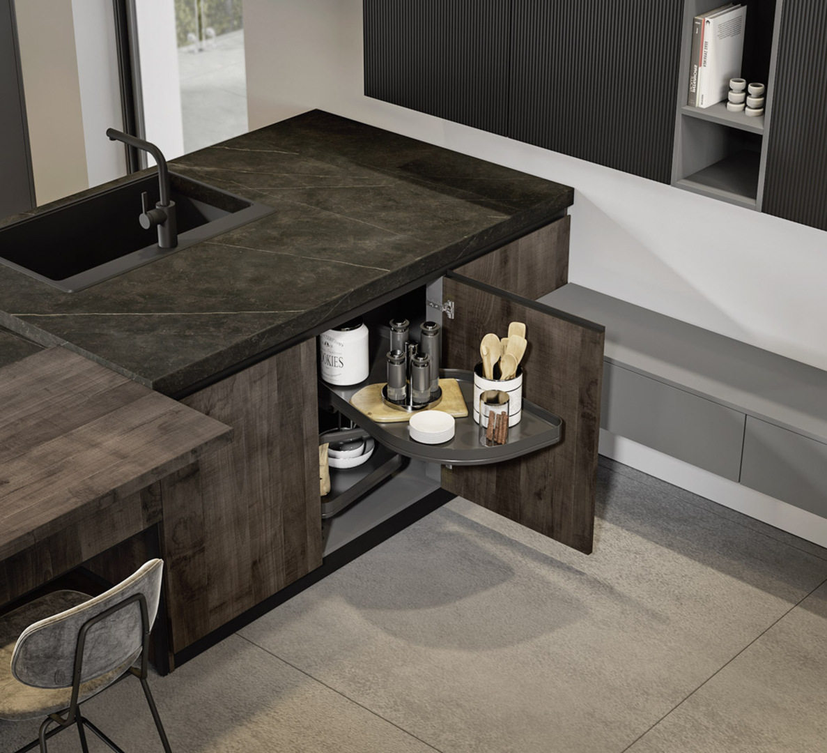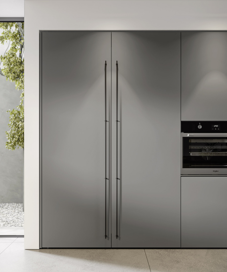 La discreta presenza del metallo, le superfici in vetro cannettato nero e le colonne di colore grigio chiaro richiamano suggestioni industrial dallo stile minimale, arricchite da tocchi di eleganza grazie alla disposizione equilibrata dei volumi.