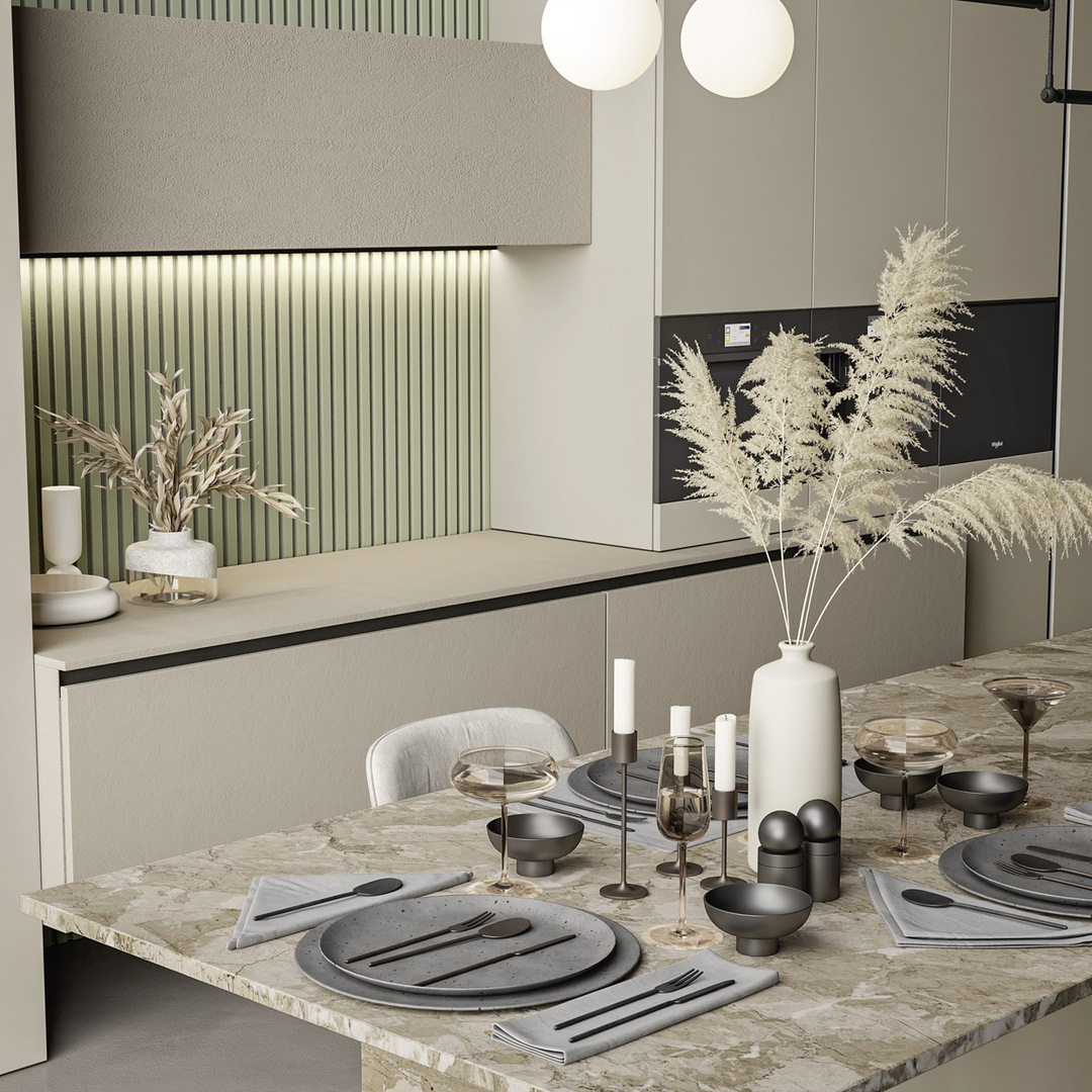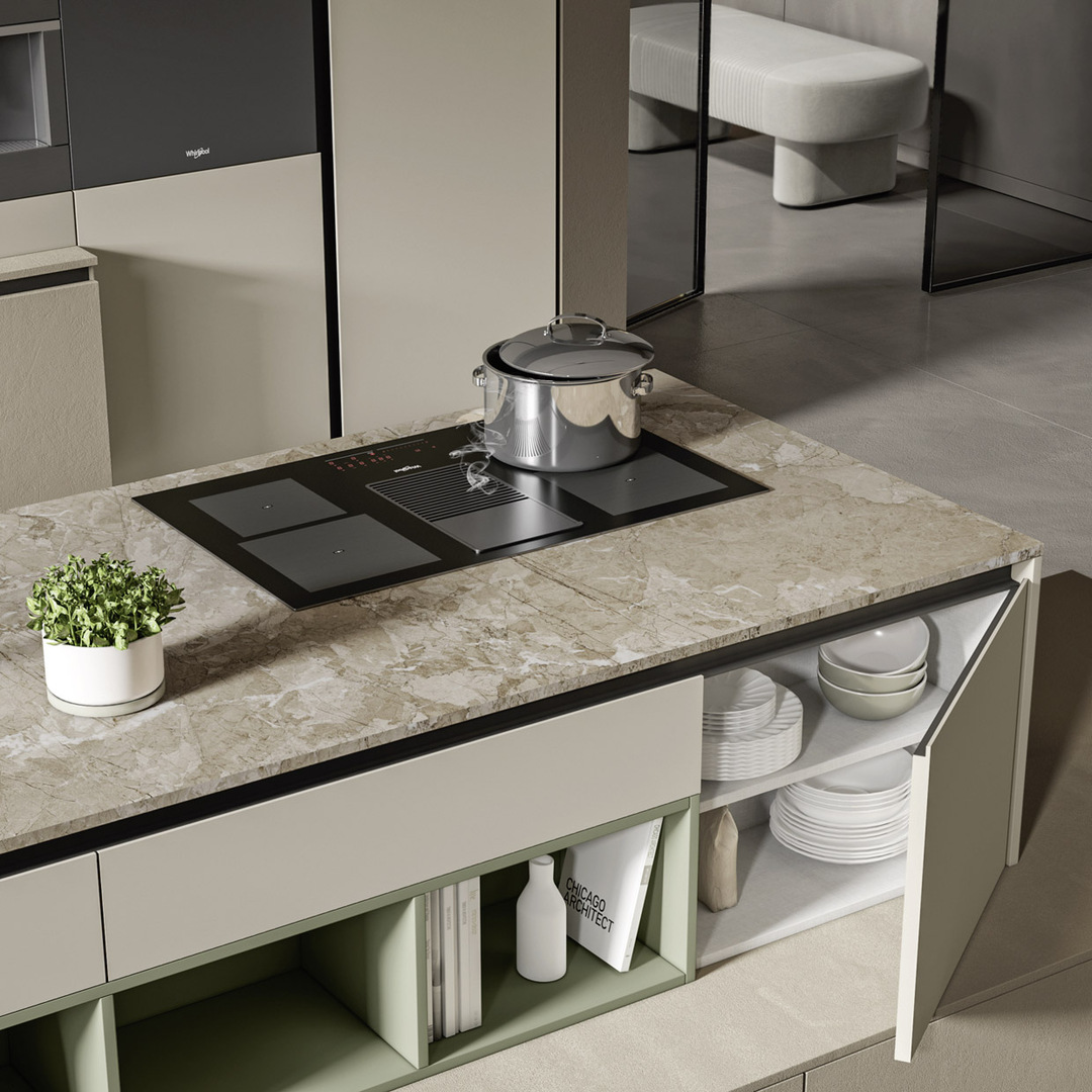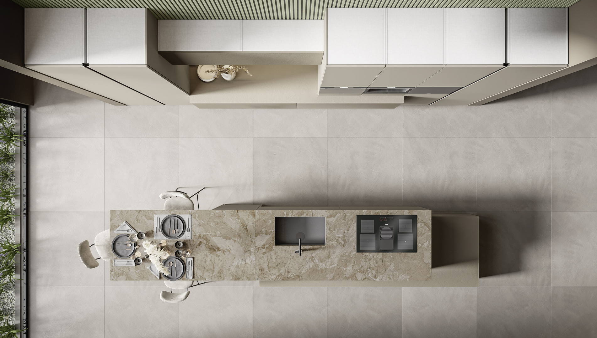 Linee definite e finiture materiche sofisticate caratterizzano lo sviluppo orizzontale della cucina. L'omogeneità del colore si armonizza con il contrasto tra superfici ruvide in PET e altre laccate, piacevolmente morbide al tatto.