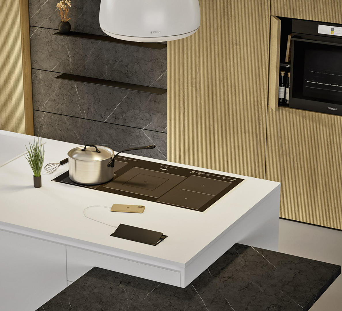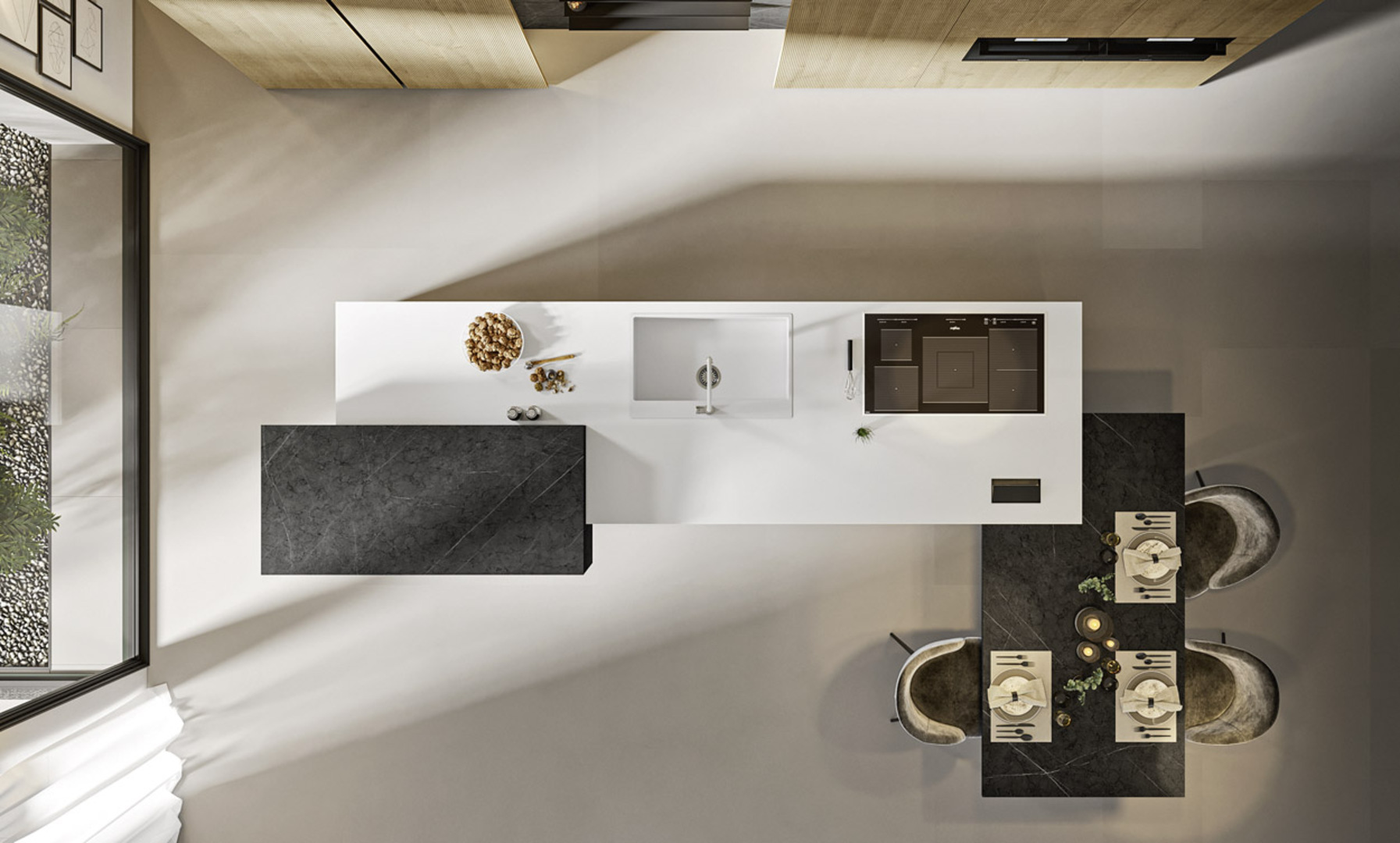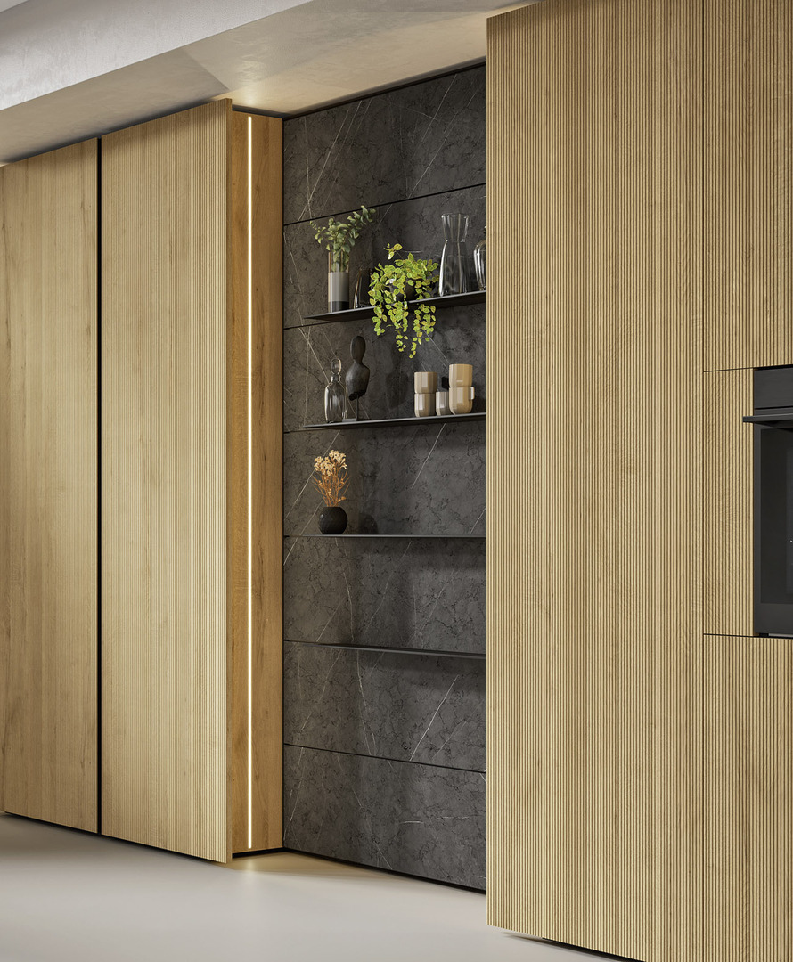 Plasmate dalla memoria delle lavorazioni degli inizi del secolo scorso, le superfici cannettate invitano a decorare le cucine di oggi, amalgamando tradizione e modernità e ispirando idee e soluzioni innovative. Il legno autentico delle colonne, con il suo rilievo caratteristico e il colore naturale, armonizza con il bianco impeccabile e l'estetica lapidea dell'isola centrale.