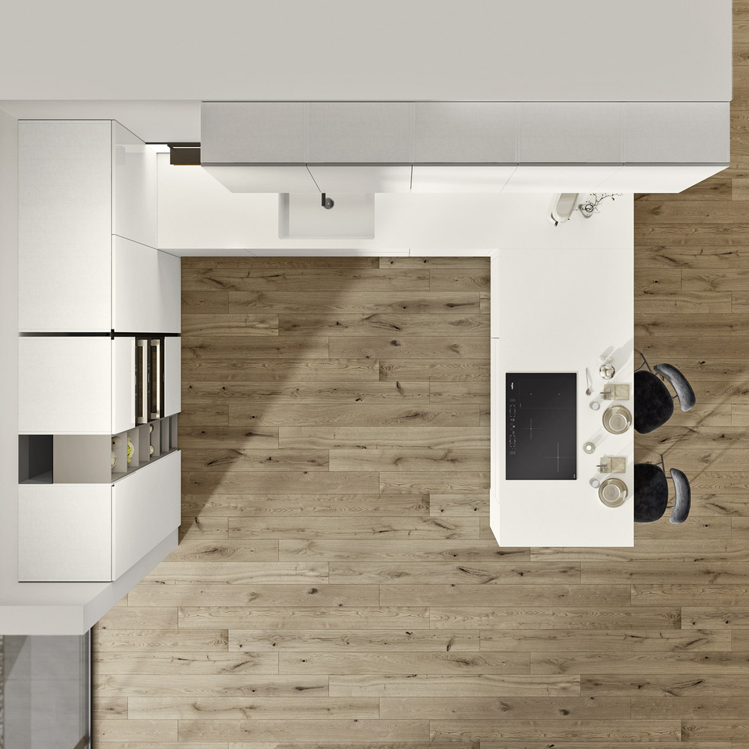I pensili a filo soffitto creano una maggiore continuità visiva e conferiscono un aspetto più integrato e rifinito all'intera area cucina.