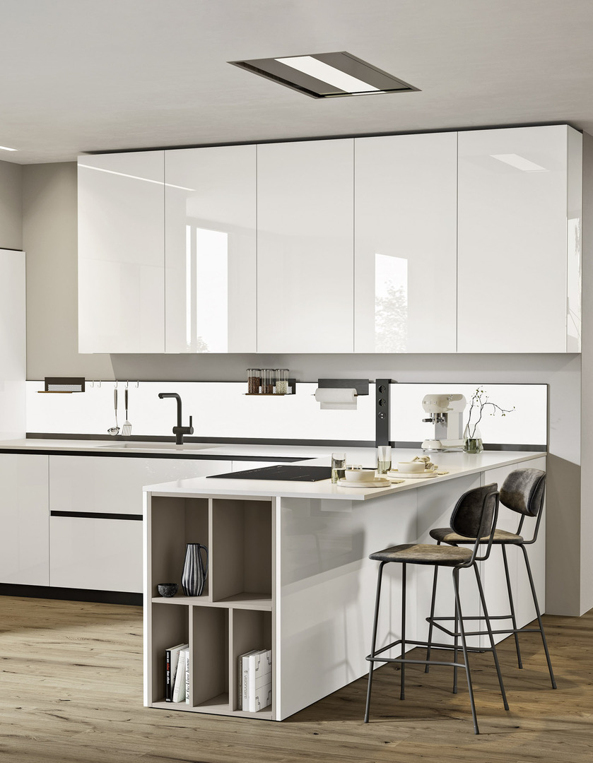 Il bianco lucido delle superfici riflette la luce naturale che filtra dalle finestre, creando un'atmosfera luminosa e invitante. Le linee pulite e moderne del design a forma di "U" conferiscono un senso di spaziosità e organizzazione, permettendo un flusso di lavoro efficiente e naturale, grazie al quale ogni elemento è raggiungibile con facilità e intuizione.