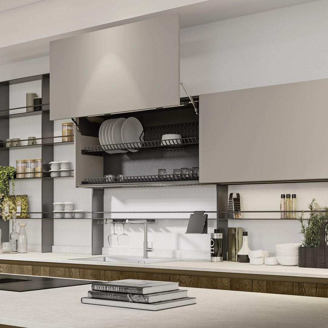 Per garantire un ambiente cucina ergonomico, integriamo meccanismi e accessori innovativi, progettati per accompagnare i movimenti naturali e per facilitare le diverse funzioni, ottenendo praticità e comfort d'uso.
