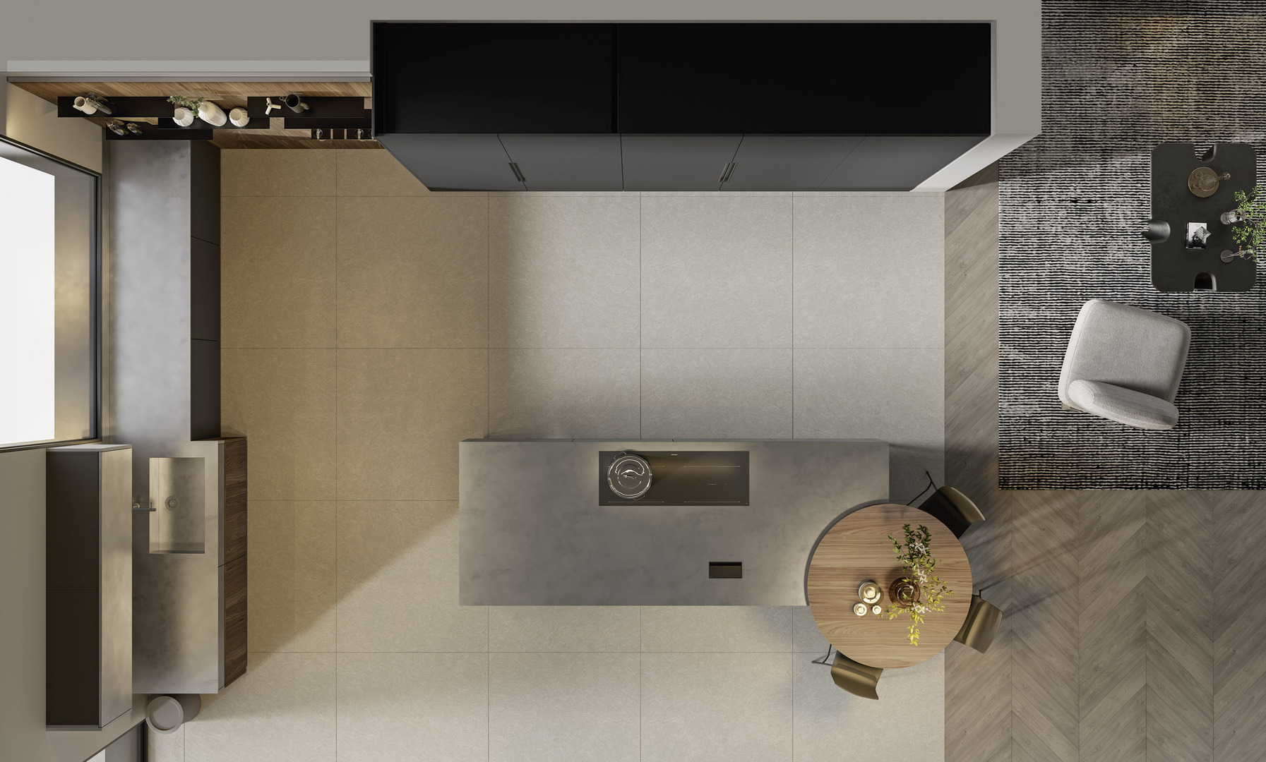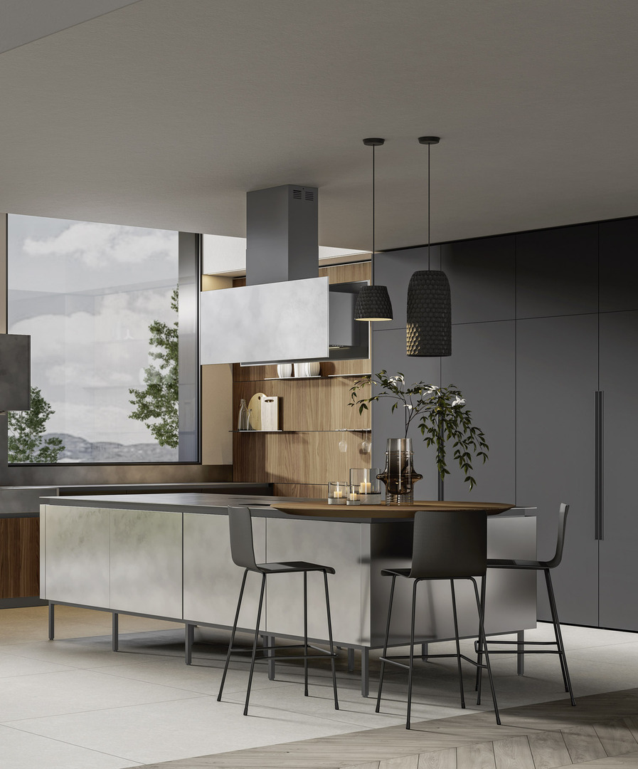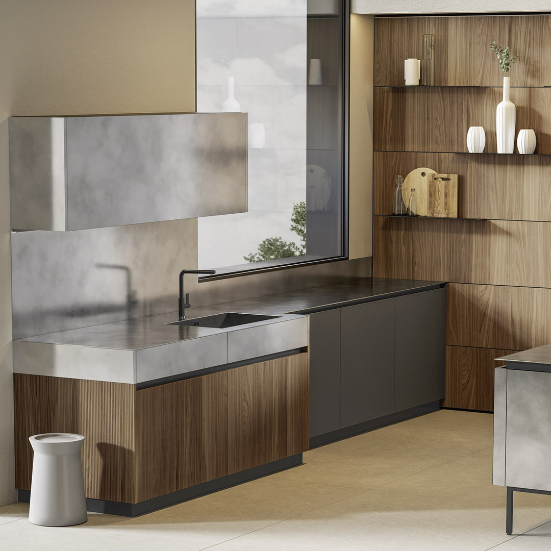 Due pareti, tre punti focali: il layout della cucina, con la sua isola in primo piano, permette di coordinare le attività in modo razionale, agevolando un'interazione fluida tra l'elemento centrale e quelli posizionati lungo la parete.