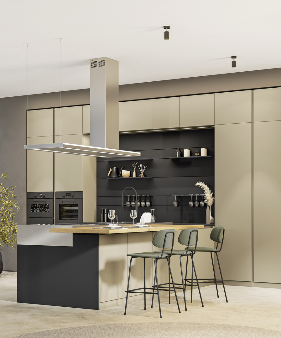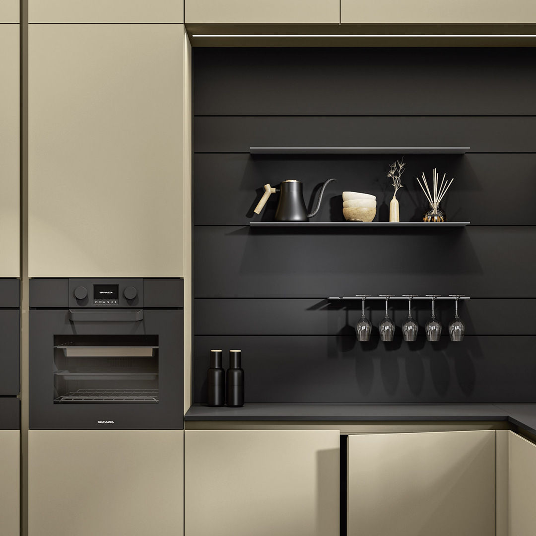 Simmetria e originalità convergono nel design: la boiserie, integrata nel disegno equilibrato di colonne e pensili, aggiunge un tocco distintivo al progetto, adattandosi con versatilità alle preferenze e alle necessità individuali.