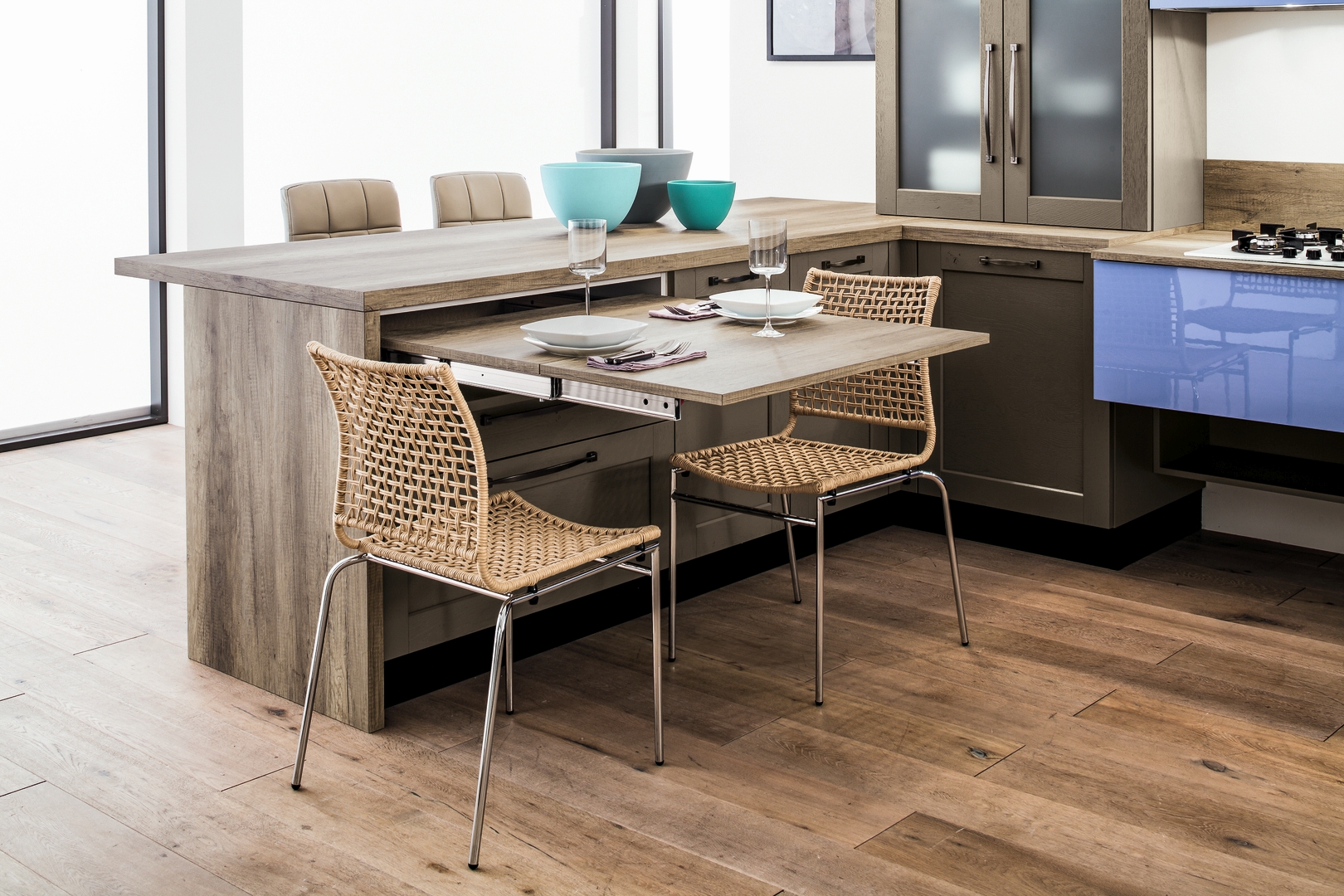 Varietà di strutture, elementi, dimensioni e disposizioni: la cucina contemporanea si può realizzare anche così, ottenendo un piacevole equilibrio pur nella diversità dei moduli.