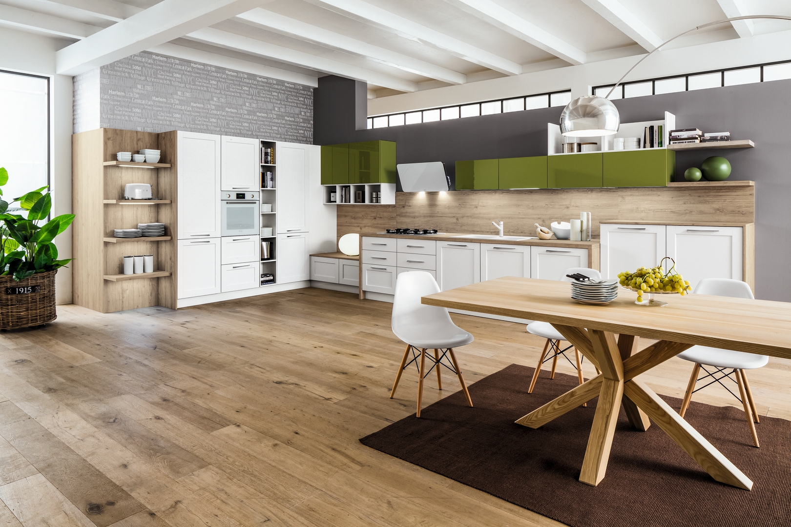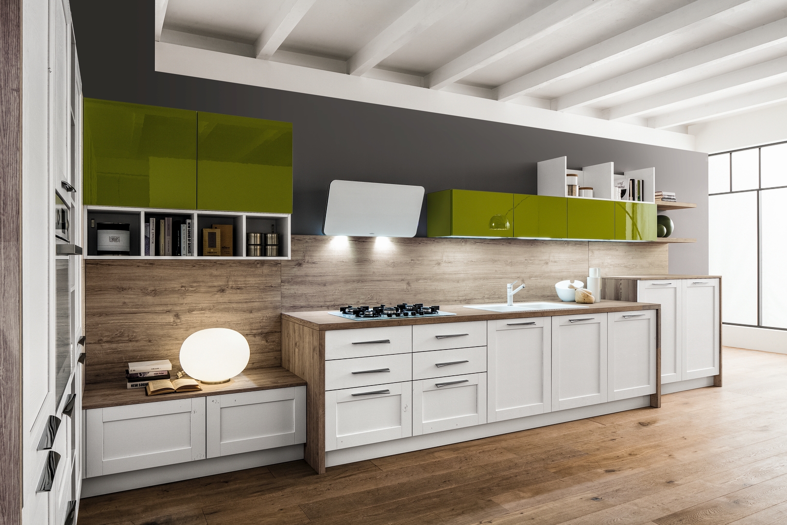 La libertà progettuale e gli schemi dinamici danno vita al design di questa cucina in legno laccato, arricchita da pensili verde lucido che si integrano piacevolmente con gli elementi distintivi della composizione.