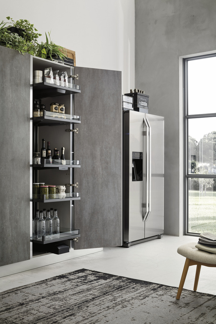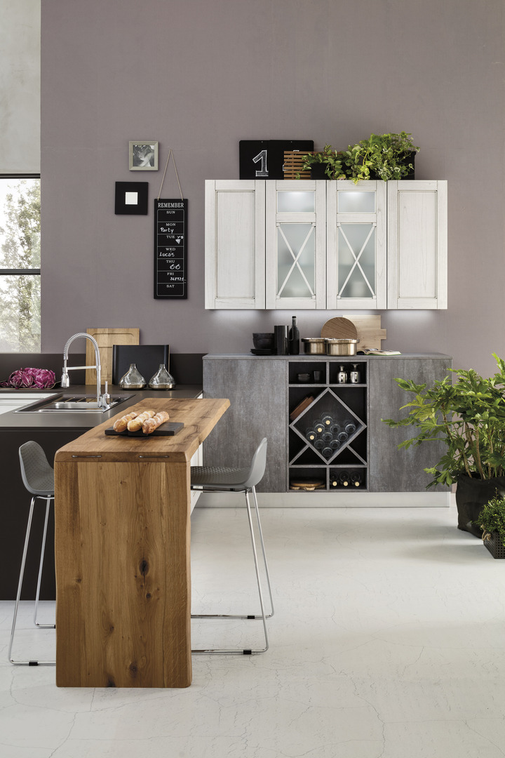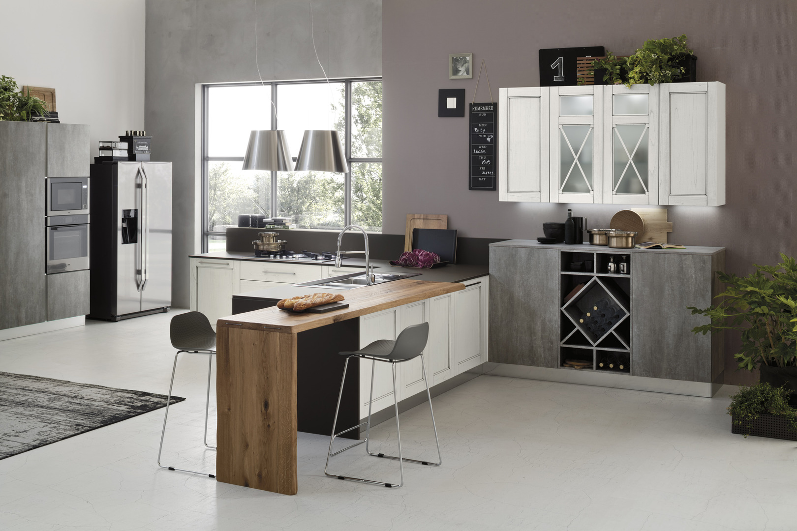 Mix di legno e materico effetto cemento per una cucina libera dagli schemi, in cui penisola, snack, vani a giorno, colonne ed elementi originali si integrano con armonia ed equilibrio.