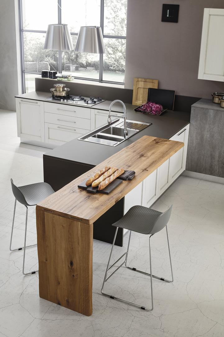Il piano snack in rovere massiccio: un pezzo d’arredo distintivo, che aggiunge carattere e raffinatezza alla cucina, esaltandone l’estetica e la qualità costruttiva.