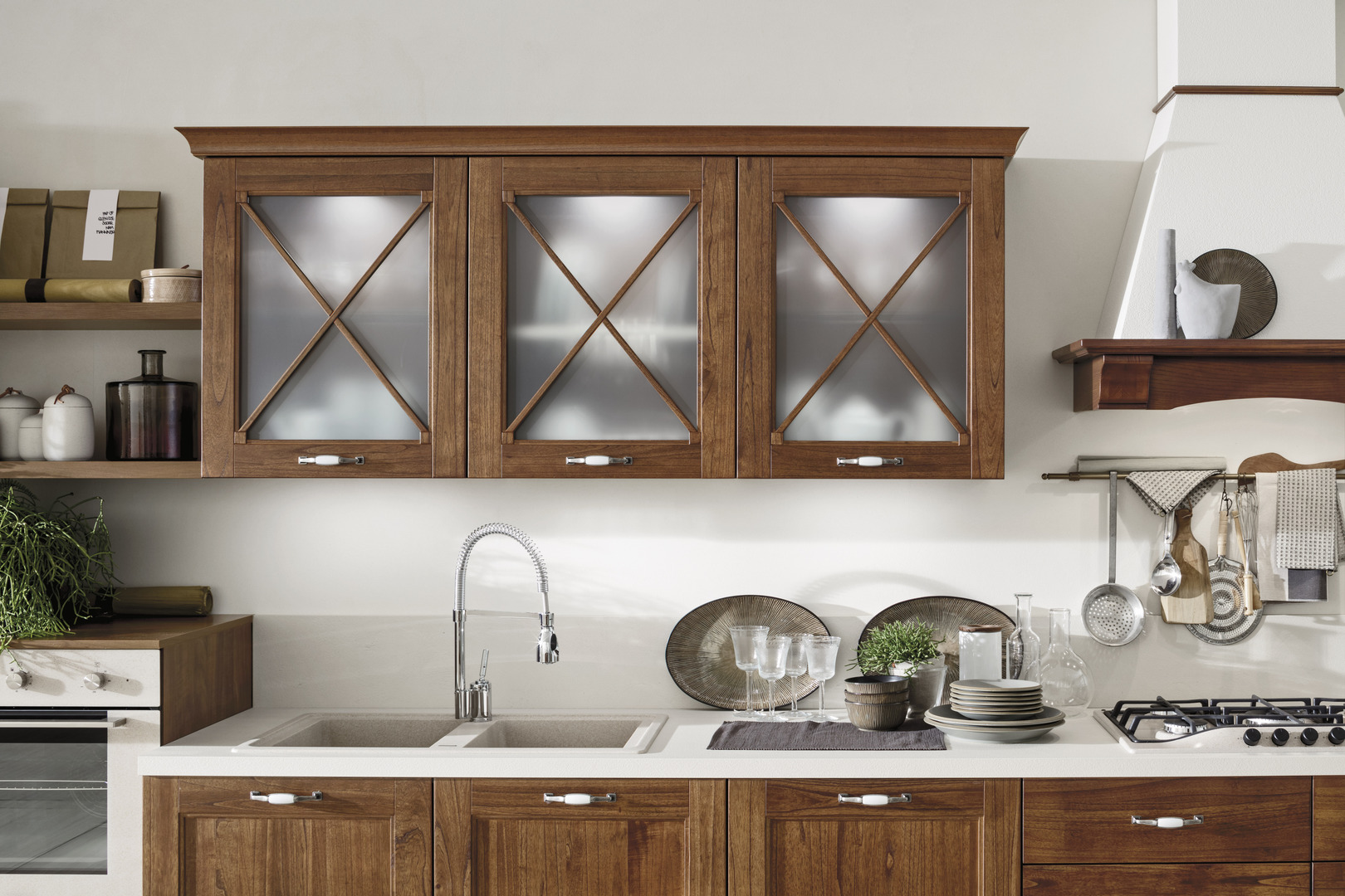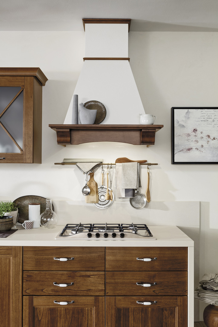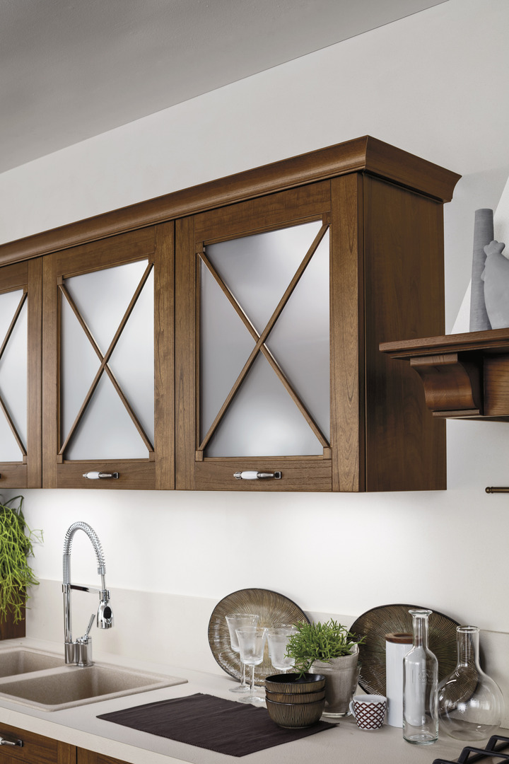 In questo progetto, la cucina in legno con la classica tinta noce si sviluppa lungo un layout lineare che percorre l'intera parete. Il gioco di altezze e profondità, insieme alle ante in vetro, dona leggerezza e dinamicità all'intera composizione.