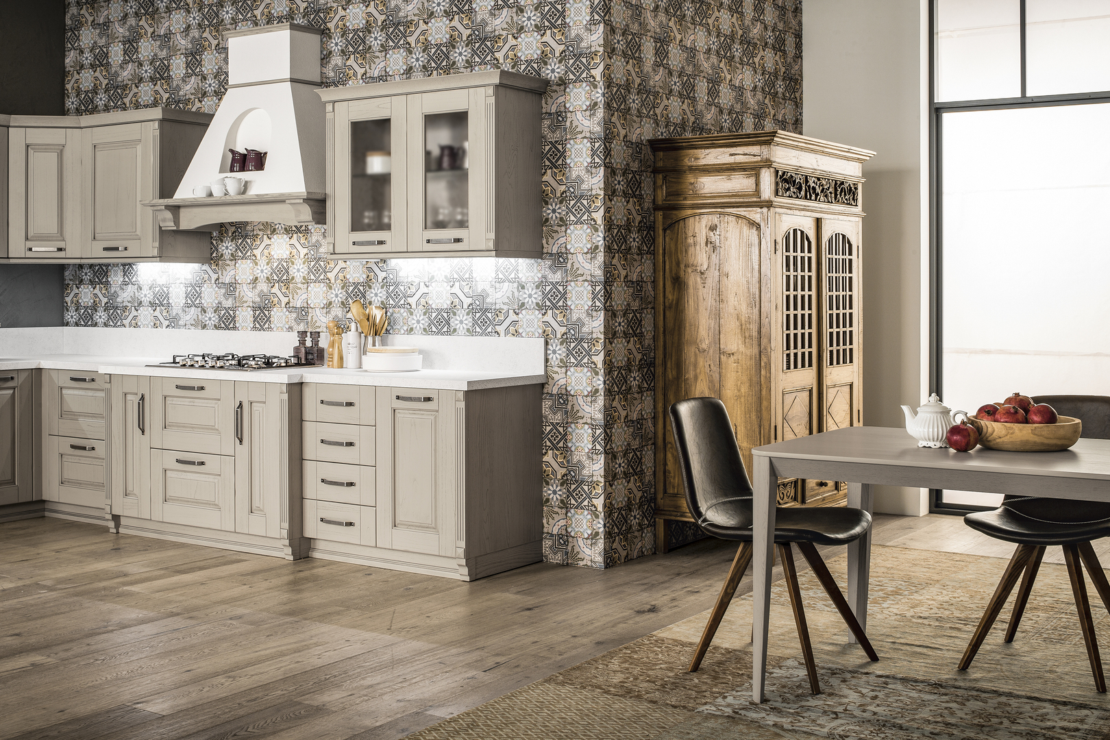 Ante e frontali in legno massiccio di colore écru, una nuance tenue e particolarmente indicata per un ambiente di elegante memoria vintage. Colonnine sagomate di grande effetto decorativo, adatte a definire elementi e volumi. Blocco cottura di maggiore profondità, ideato e realizzato come elemento distintivo perfettamente integrato nella composizione. Soluzioni d'impatto per progetti senza tempo.