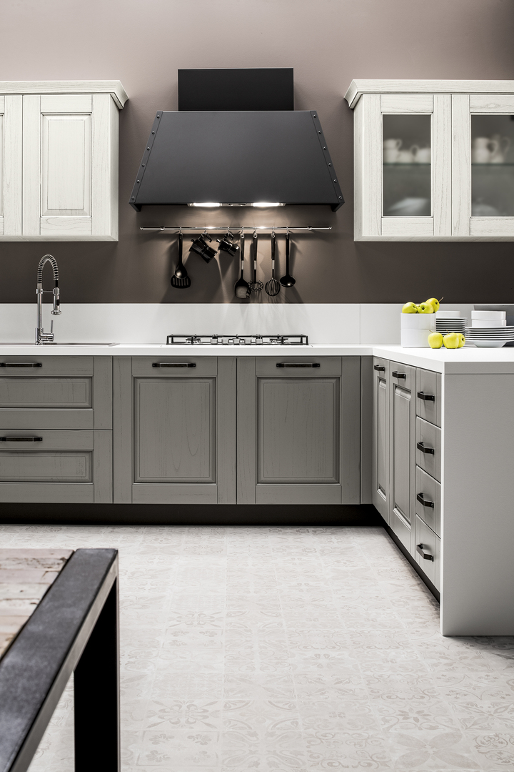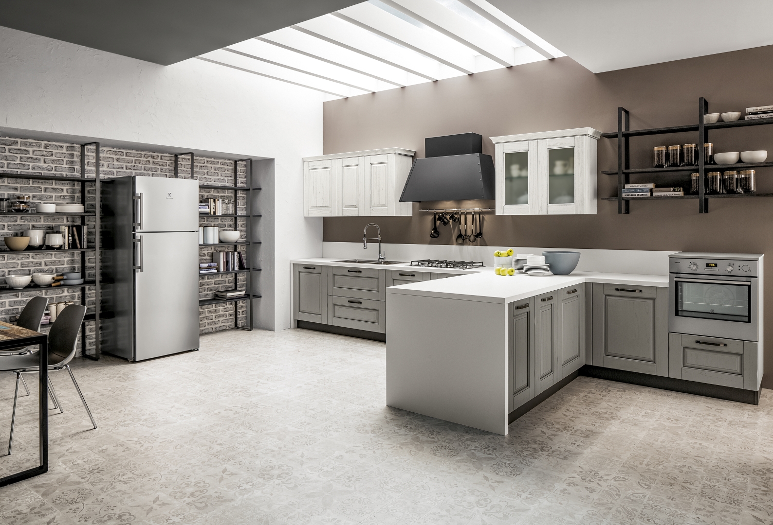 Richiamando l'essenza e il carattere distintivo dello stile industriale, una terza parete accoglie il telaio “Officina” in metallo colore Antracite con mensole in laminato e un grande frigorifero in acciaio a libera installazione.