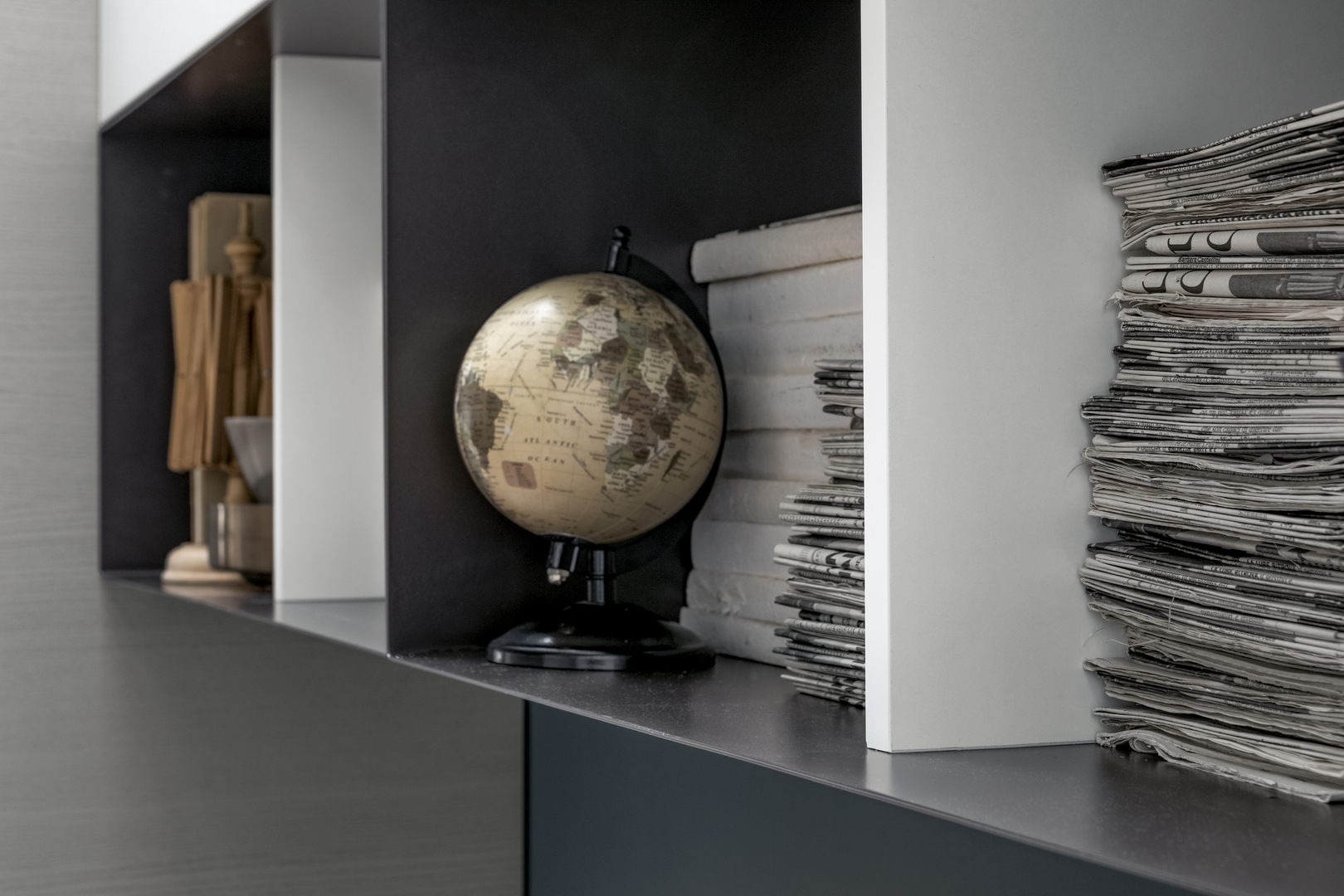 Un innovativo progetto che ridefinisce il concetto di cucina come uno spazio attivo e poliedrico, unendo living, area snack, mensole-laboratorio e zona relax in un unico ambiente integrato, valorizzandone l’estetica e il piacere visivo.
