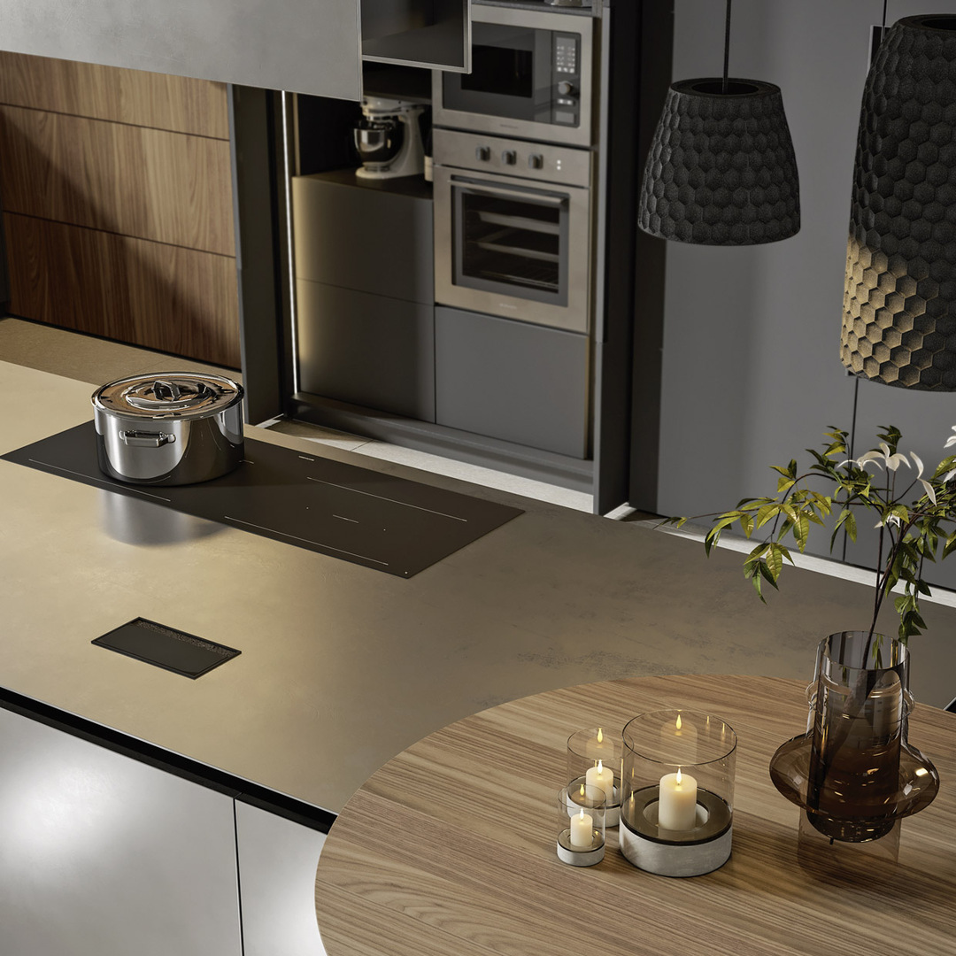 Due pareti, tre punti focali: il layout della cucina, con la sua isola in primo piano, permette di coordinare le attività in modo razionale, agevolando un'interazione fluida tra l'elemento centrale e quelli posizionati lungo la parete.